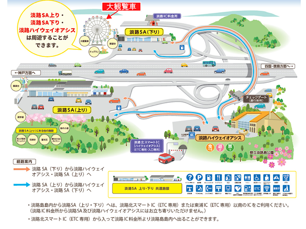 本州側から明石海峡大橋を渡ったところに位置する淡路SAは、神戸淡路鳴門自動車道の本州側からの玄関口に当たり、Uターン・上下線・一般道へといろいろな方向に進むことが出来ます。