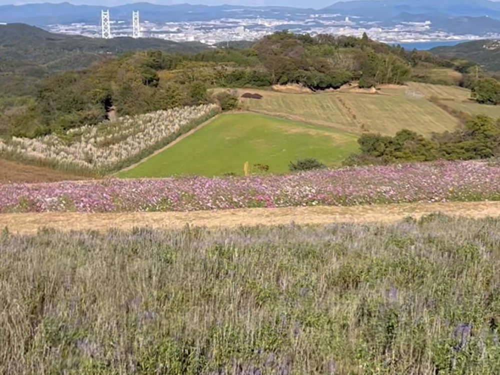 あわじ花さじきは、淡路島北部の丘陵地域の頂上部に位置し、大阪湾に面したなだらかな高原一面に(面積約15ha)季節の花々が美しく咲き誇ります。