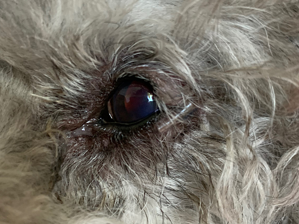 2021年5月、散歩中に左目を細める様子があり受診したところ、左目の水晶前方脱臼と眼圧上昇が判明。